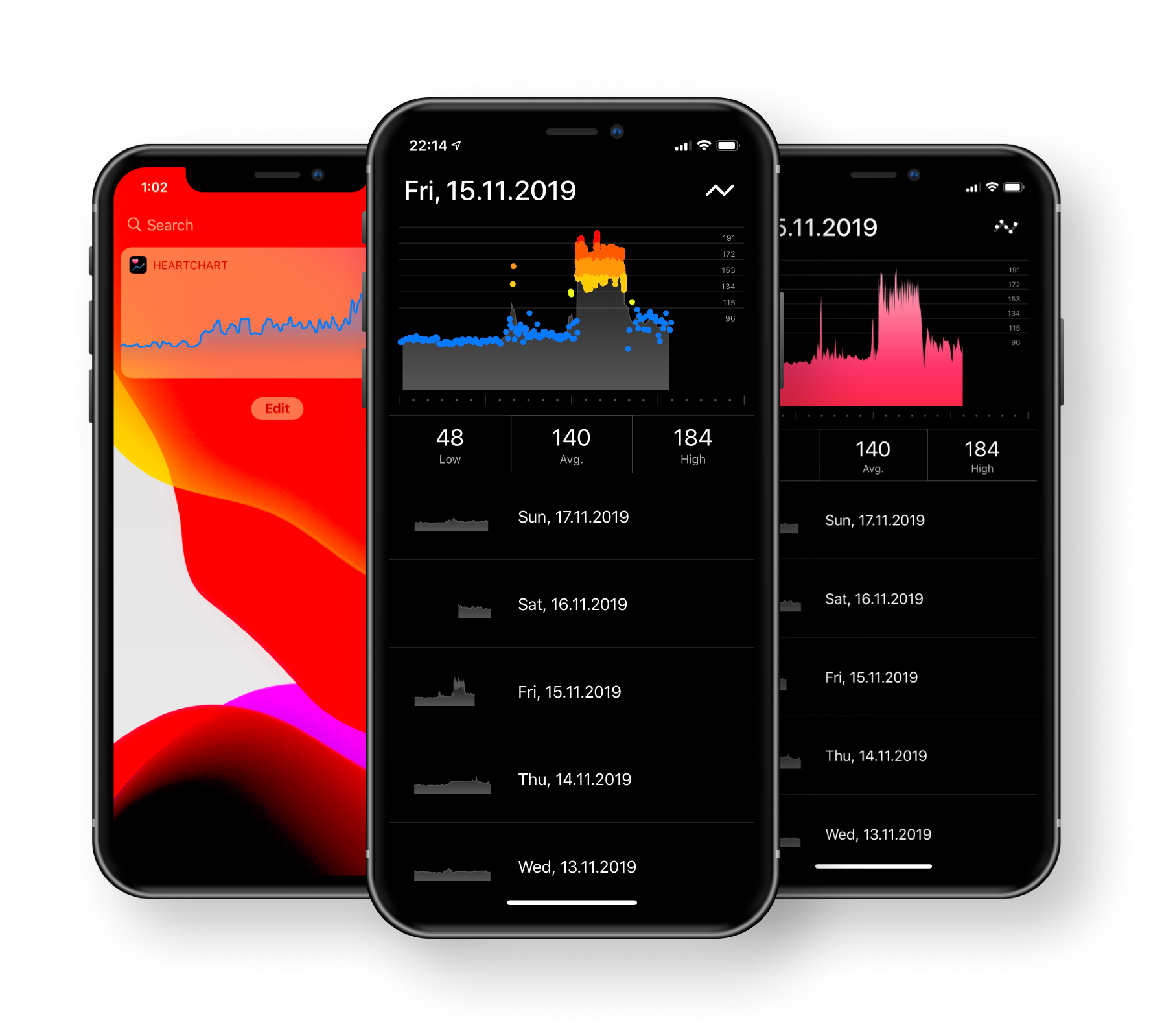 HeartChart lets you view your heart rate data as scatter plots and line charts. Useful for when you want to take a closer look at your heart rate data and see the exact measurements from your smart watch or other heart rate recording device. Because the data is read from Apple HealthKit, any device which stores heart rate data in HealthKit will be compatible with HeartChart, such as Apple Watches, Polars, Garmins etc.